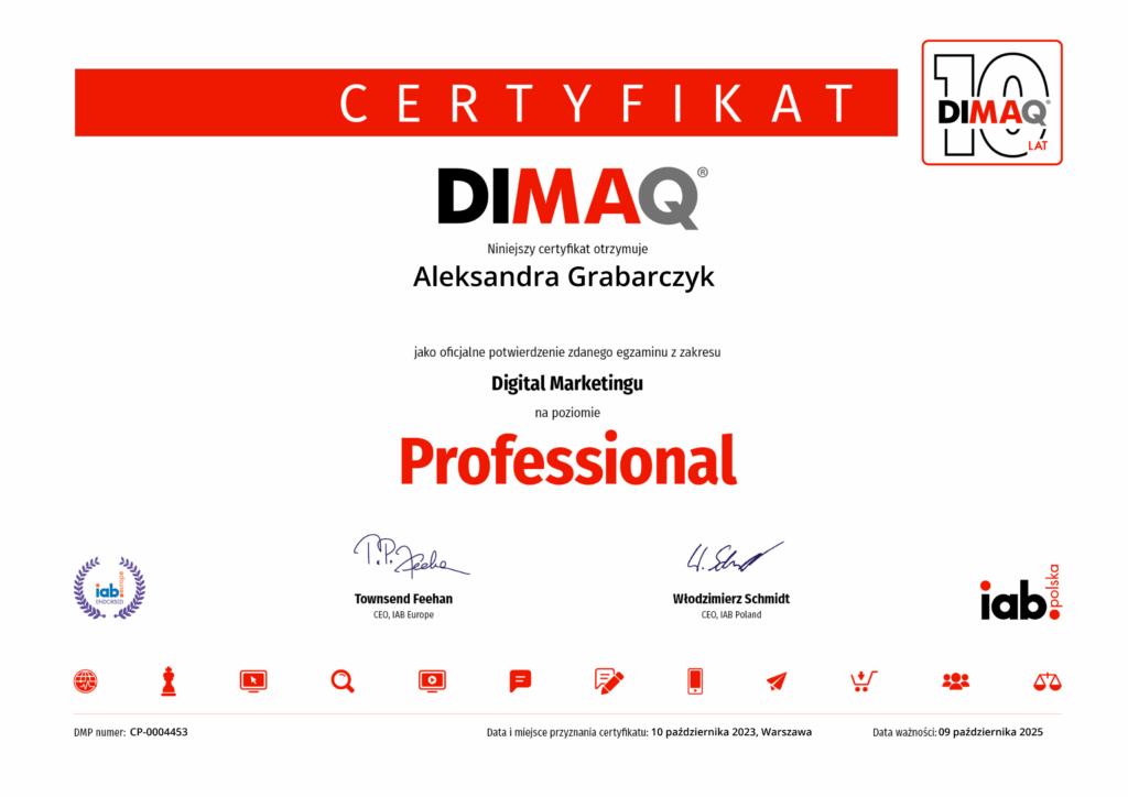 Mam potwierdzoną wiedzę z wielu obszarów marketingu online – od strategii, przez e-mail marketing, SEO, UX, po analitykę i e-commerce.